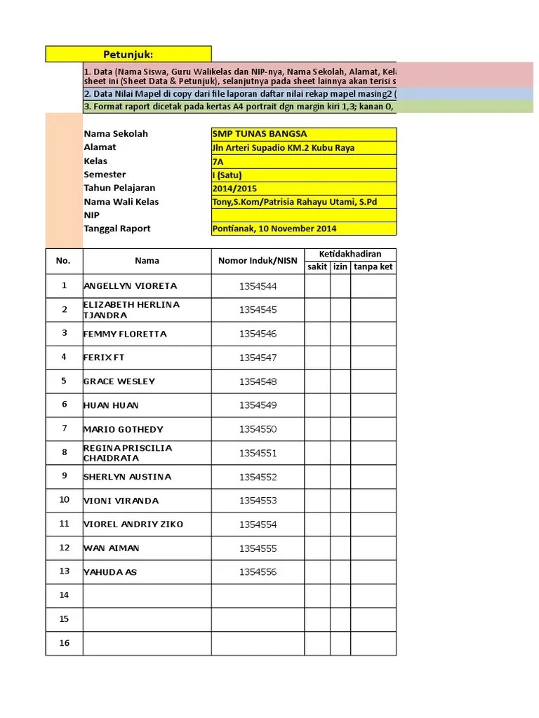 Simak terus videonya sampai selesai. Jun 15, 2014 · daftar nilai rapor fisika kelas x sma kebangsaan lampung selatan t.p. ===== semoga video ini bermanfaat. Oct 01, 2018 · format daftar nilai siswa kurikulum 2013 sma/ma/smk menggunakan aplikasi excel ini akan kita butuhkan dikala kita sebagai guru melaksanakan proses evaluasi kepada siswa. Dalam kesempatan ini saya akan share kepada anda contoh daftar nilai siswa kurikulum 2013 ini secara gratis. Aug 10, 2017 · maka dari pada itu saya akan membagikannya sesuai dengan apa yang menjadi penelusuran terkait dengan format buku nilai misalnya contoh daftar nilai siswa smp kurikulum 2013, format daftar nilai ktsp smp, daftar nilai siswa excel, format daftar nilai siswa smp, format daftar nilai harian, download daftar nilai siswa excel, format penilaian siswa. Dalam format penilaian (daftar nilai) ini seluruh nilai siswa disimpan secara teratur sesuai dengan aspek yang dinilai. Format penilaian merupakan suatu dokumen yang sangat penting untuk di miliki oleh setiap guru mata pelajaran di sekolah, dimana format penilaian tersebut di gunakan untuk memudahkan guru dalam menginput hasil nilai terhadap peserta didiknya. Demikian postingan saya kali ini, silahkan di download, semoga bisa menjadi salah satu jalan. Siswa ditugaskan menyiapkan alat, bahan, dan langkah. Biasanya format ini dibukukan dengan format absen siswa dan dibuat pada awal tahun pembelajaran. Download perangkat pembelajaran smp kelas 7, 8, dan 9. Jan 05, 2017 · contoh format daftar nilai siswa kurikulum 2013 untuk guru mata pelajaran ini mungkin bermanfaat juga bagi anda yang membutuhkan referensi yang berhubungan juga dengan pencarian berkas format daftar nilai siswa lainnya sebagai contoh perbandingan seperti format penilaian kurikulum 2013 sd mi smp mts sma ma, format penilaian kurikulum 2013 smp.