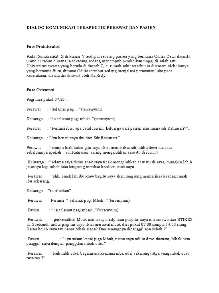 Indentitas, alamat, pekerjaan dan penyakit yang saat ini . View dialog.docx from nursing misc at university of notre dame. Terapeutik antara perawat dengan pasien anxiety disorder di. Berikut ini contoh percakapan antara perawat dengan pasiennya: Jika dilihat dari percakapan di atas, perawat magdalena sudah melakukan fase kerja pada .