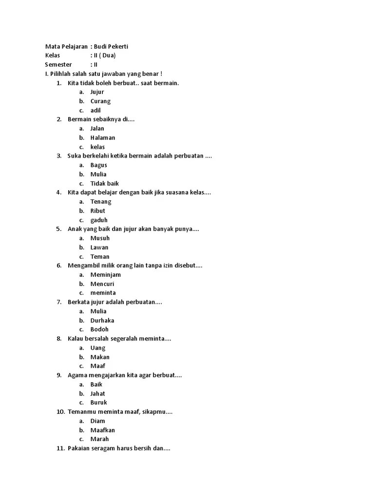 Bahasa indonesia, mata pelajaran bahasa indonesia kelas 8, evaluasi umum. Soal uts bahasa indonesia kelas 2 semester 2 genap terbaru. Soal uas pai dan budi pekerti kelas 2 sd semester 2 lengkap. Pilihlah salah satu jawaban yang benar ! Pak dan budi pekerti kelas 4 edisi revisi.